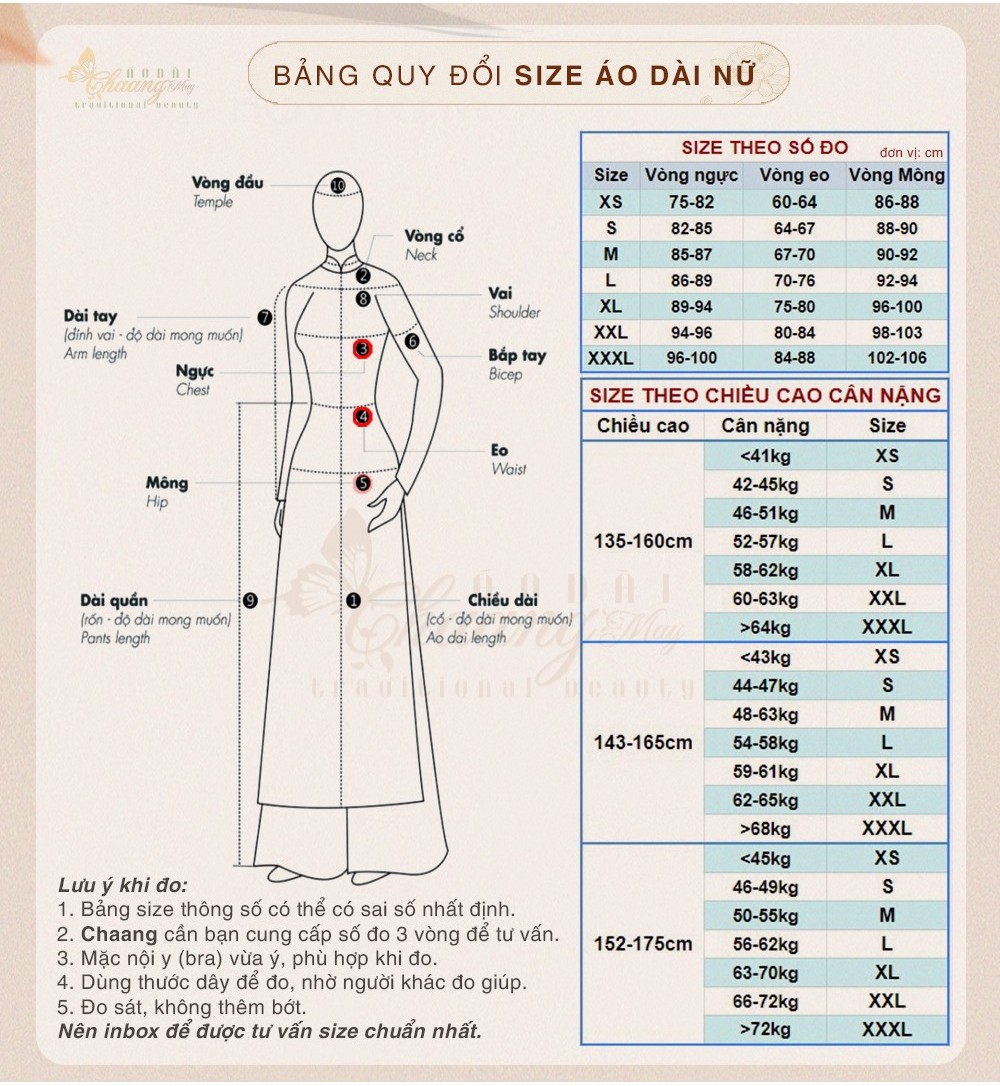 ➡ Áo dài cách tân truyền thống Chaang May các size phổ thông cho nữ khoảng 35 đến 65kg
