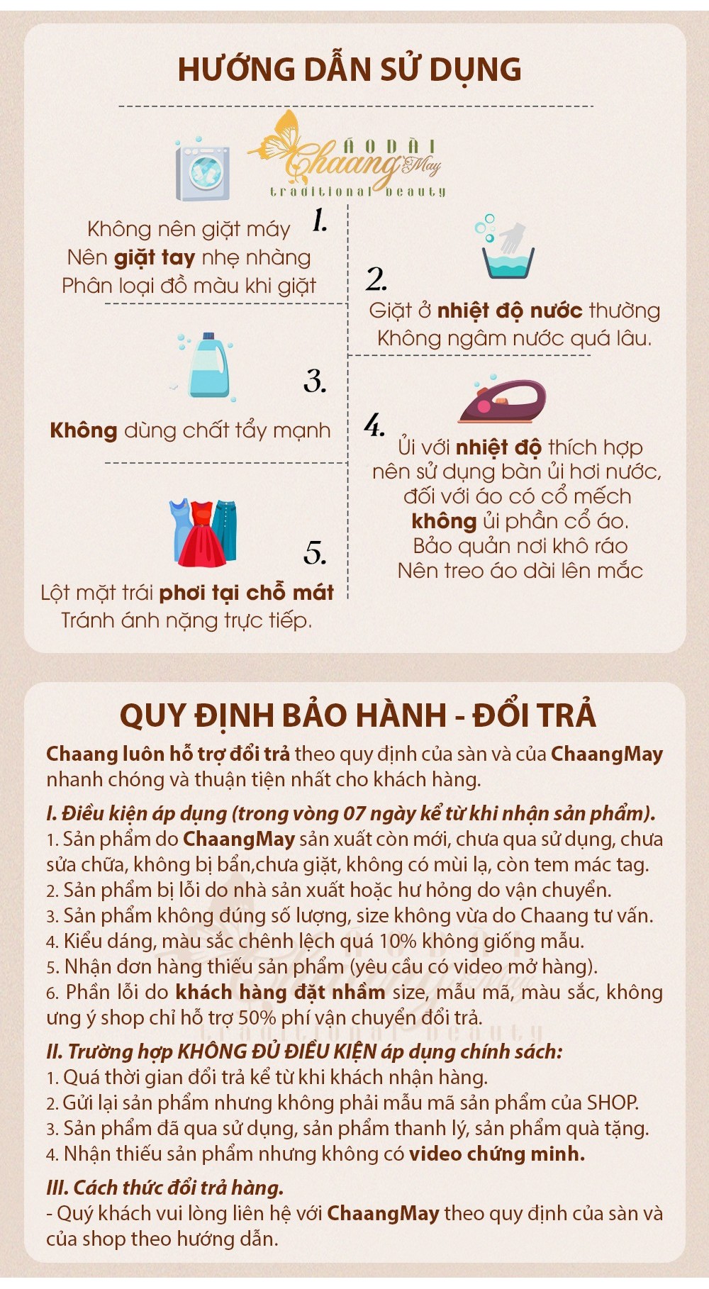 - Kiểu dáng: Cổ vuông cao 2cm, tay lỡ, 2 tà. Đường may chắc chắn và tinh tế, khóa kéo sau lưng dễ mặc, mang đến độ bền đẹp lâu dài cho sản phẩm.